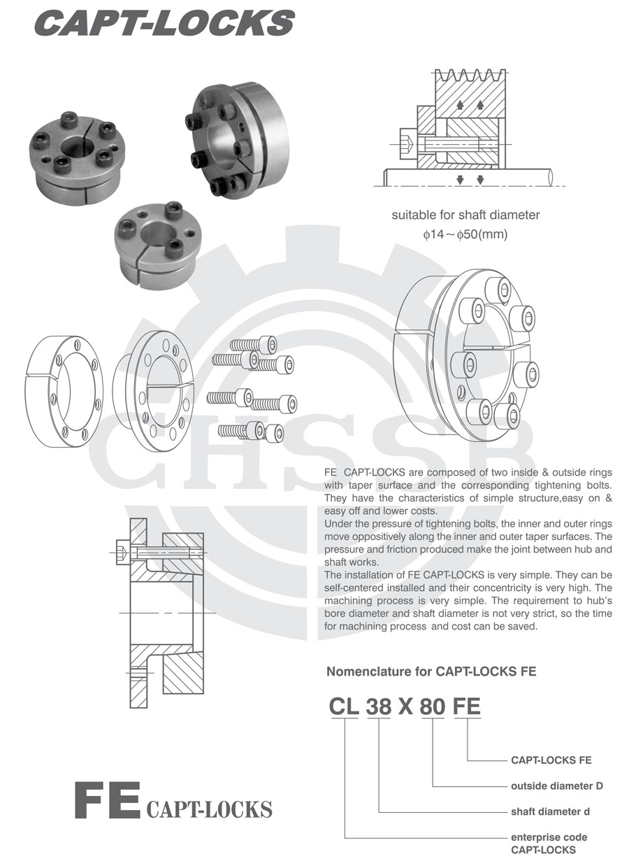 FE型脹緊聯結套由兩個帶錐面的內外環和相應壓緊螺釘組成,具有結構簡單,拆卸方便,低成本等特點。在壓